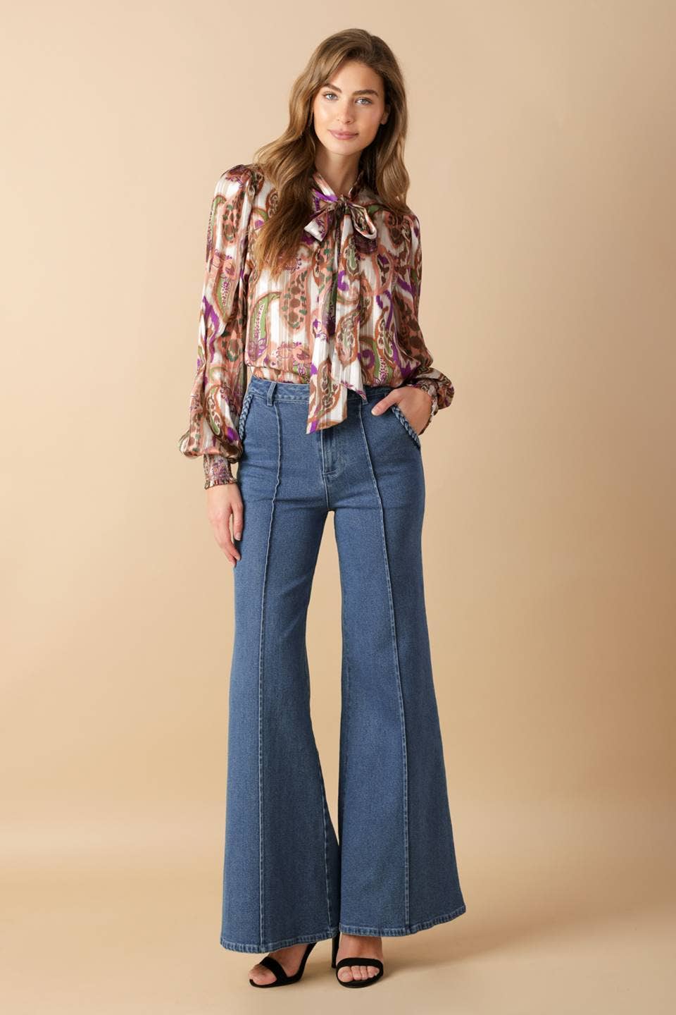 A printed woven top featuring front bow tie and long sleeve with smocked cuff.
