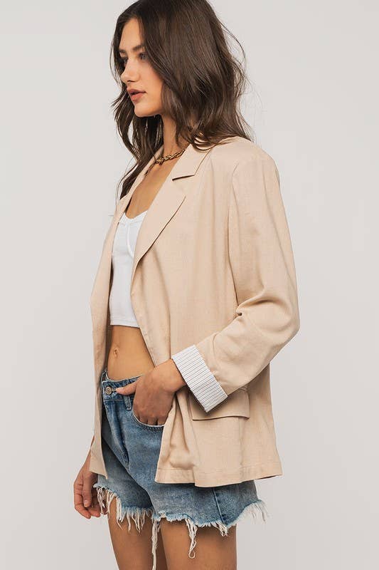 This lightweight, single-breasted blazer features a modern touch: pinstripe lining visible when the sleeves are cuffed. Crafted from a soft linen blend, it's a versatile piece perfect for adding a touch of sophistication to any outfit. Features: • 88% Viscose, 12% Linen • S-L: 2-2-2 • Single-breasted design • Pinstripe lining at cuff • Lightweight, breathable fabric Classic